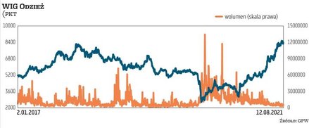 WIG-odzież, indeks grupujący kilkanaście spółek handlujących odzieżą, obuwiem, biżuterią i coraz częściej także innym asortymentem, np. towarami wyposażenia domowego i perfumami, notowane na warszawskiej giełdzie to tegoroczny rekordzista wzrostu. Od początku 2021 roku zyskał na wartości ponad 60 proc., a w ciągu 12 miesięcy – ponad 90 proc.