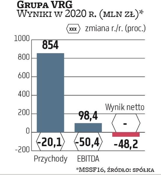 VRG, podobnie jak wiele innych firm, zamierza odrabiać w tym roku straty zanotowane w pierwszym roku epidemii Covid-19. W 2020 r. przychody grupy spadły o 20 proc., a z uwzględnieniem standardu MSSF16 zysk operacyjny powiększony o amortyzację (EBITDA) o ponad połowę. Strata netto VRG przekroczyła 48 mln zł.
