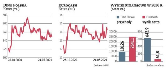 Mijają blisko dwa tygodnie, od kiedy Eurocash oraz Dino Polska zaprezentowały wyniki za IV kwartał 2020 r. Reakcje były różne. Akcje Dino w środę pod koniec sesji były wyceniane na 249,2 zł, co oznacza blisko 14-proc. przecenę od początku roku. Był to jednak moment szczytu notowań, a za walory Dino płacono nawet po 300 zł. Akcje Eurocashu poruszają się od miesięcy w zakresie 13–15 zł. Po publikacji wyników finansowych notowania firmy runęły o ponad 11 proc., natomiast ostatnio odrabiają straty. A kapitalizacja? Wartość giełdowa Dino to 24,4 mld zł, z kolei Eurocashu ledwie 2 mld zł.
