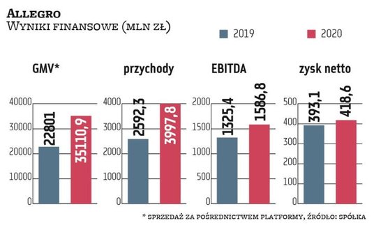 Wyniki nie dają powodów do narzekań, w czwartym kwartale wartość sprzedanych produktów na platformie Allegro wyniosła 10,85 mld zł, czyli 57,5 proc. więcej niż rok wcześniej. EBITDA wyniosła 513,5 mln zł po wzroście o 34,9 proc.