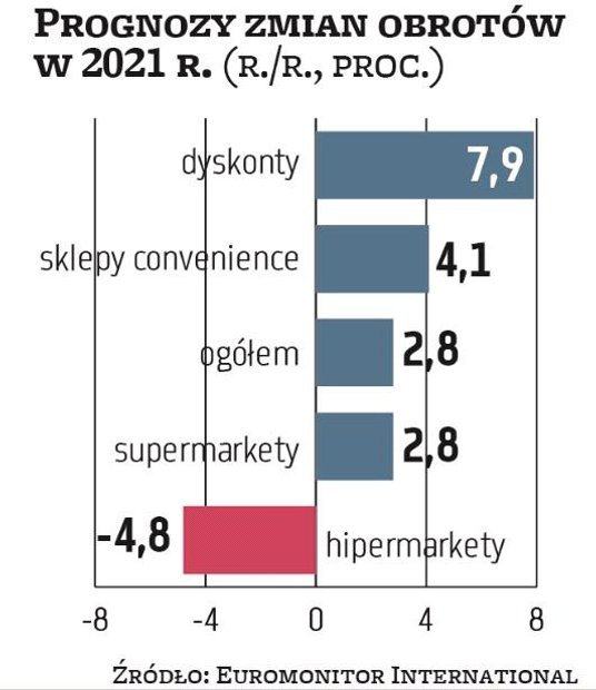 W centrach trudno o optymizm, ale sektor spożywczy ma szanse na lepszy wynik. Z danych Euromonitor International wynika, że w 2021 r. rynek ma urosnąć o 2,8 proc. po 0,9-proc. spadku w 2020 r. – dane w cenach stałych.