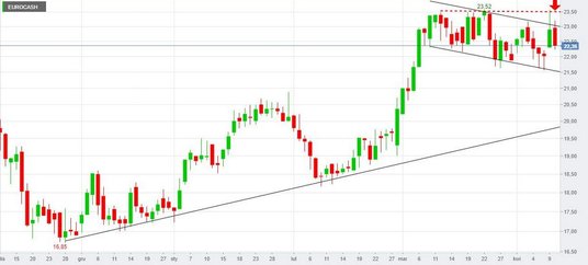 Kurs akcji Eurocashu, polskiego dystrybutora produktów FMCG, spadał około 13.30 o 2,6 proc. Spadek ten może być rozczarowujący, ponieważ wtorkowa sesja, w trakcie której kurs rósł nawet o 7 proc. (na koniec zwyżka wyniosła 4 proc.), rozbudziła nadzieję na wyłamanie z kreślonego od marca kanału spadkowego i przebicie oporu na poziomie około 23,50 zł.