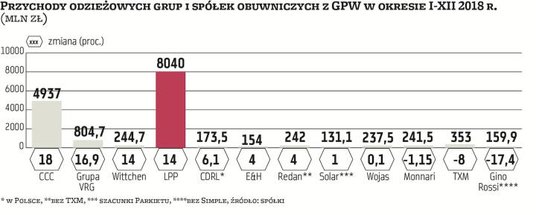 W 2018 r. większości firm odzieżowych i obuwniczych z GPW udało się podnieść przychody – wynika z zestawienia przygotowanego przez „Parkiet". Najlepiej wypadły pod względem tempa wzrostu firmy, które konsolidowały inne: CCC oraz VRG, czyli dawna Vistula. Największym przegranym było obuwnicze Gino Rossi, którego kłopoty z płynnością finansową zakończyły się podziałem grupy.