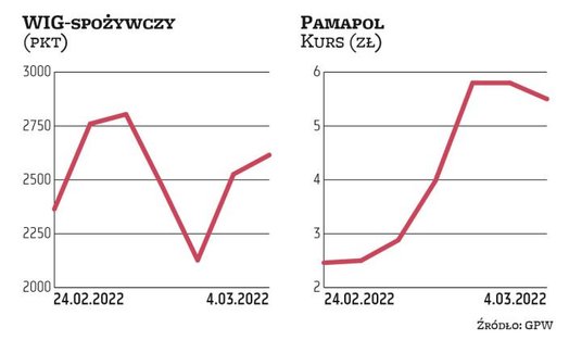 Od początku inwazji Rosji w Ukrainie ceny akcji spółek spożywczych, jak Pamapol, Makarony Polskie, Seko czy Gobarto, podskoczyły odpowiednio o 123 proc., 32 proc., 20 proc. i 35 proc. Choć w piątek wszystkie z wyżej wymienionych firmy notowały mniejsze lub większe spadki notowań, to kursy wciąż były wyraźnie powyżej poziomu sprzed daty wybuchu konfliktu.