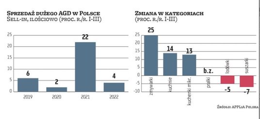 W tym roku rozwój sektora jednak mocno zwolnił. Z ostatnich danych organizacji producentów APPLiA Polska wynika, że do końca marca ilościowo wzrost wynosił jedynie 4 proc., co było w dużej części efektem wysokiego wzrostu sprzedaży zmywarek. Takie kategorie jak lodówki czy suszarki do ubrań, notują nawet spadki w ujęciu rocznym.