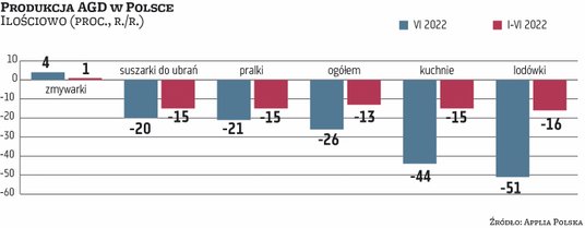 Polska jest największym producentem AGD w Europie, więc w oczywisty sposób polskie zakłady najmocniej odczuwają zmiany koniunktury na kontynencie. Stosunkowo najsłabiej, bo o 9 proc., spadł eksport na najważniejszy rynek, niemiecki, ale do Francji już o 13 proc., a Wielkiej Brytanii o 16 proc. Także w Polsce koniunktura słabnie, w czerwcu o 3 proc. spadły zakupy sprzętu sieci handlowych, wynik półrocza jest już tylko minimalnie ponad poziom z 2021 r.