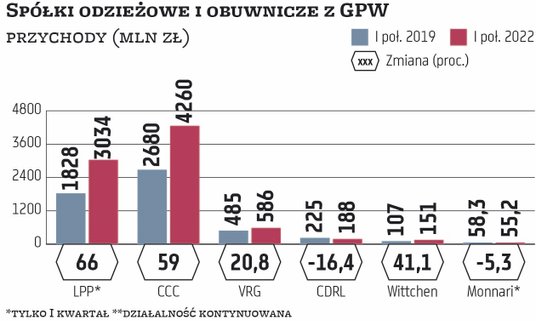 W porównaniu z wynikami z 2019 roku, ostatniego roku przed kryzysem wywołanym obostrzeniami mającymi ograniczyć rozprzestrzenianie koronawirusa Covid-19 przychody większości firm są istotnie wyższe. Jak wskazuje zestawienie przygotowane przez „Parkiet”, najmocniej urosły od tego czasu biznesy gigantów: LPP (wg danych za I kwartał) oraz CCC (wg wstępnych danych zarządu). Skonsolidowane przychody tych firm są w tym roku odpowiednio o 66 proc. i 59 proc. wyższe niż w analogicznych okresach przedpandemicznego 2019 roku.