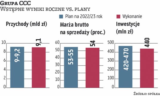 Analitycy oczekiwali, że Grupa CCC przy 2,42 mld zł przychodów wykaże 102 mln zł zysku operacyjnego powiększonego o amortyzację (EBITDA). Szacunki zarządu co do przychodów są zbieżne z tymi oczekiwaniami, ale EBITDA sporo niższa, bo wynieść ma 86 mln zł, a po korekcie o zdarzenia jednorazowe 47 mln zł (tyle, ile rok wcześniej). Strata operacyjna grupy powiększyła się do 57 mln zł.