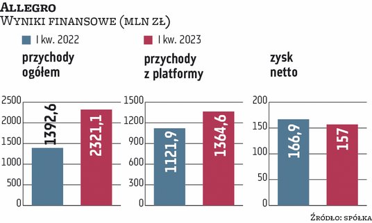 Allegro też optymistycznie patrzy w przyszłość. W drugim kwartale 2023 r. planuje wzrost GMV z działalności w Polsce na poziomie 11–12 proc. r./r., przy wzroście przychodów o 16–18 proc. i skorygowanej EBITDA o 13–16 proc. r./r. W Czechach przewidywana wartość GMV spadnie w drugim kwartale o 3–6 proc. r./r., przychody będą o 8–11 proc. niższe r./r., a skorygowana strata EBITDA wyniesie 110–120 mln zł. Wydatki inwestycyjne szacowane są na 110–120 mln zł w Polsce i 35–40 mln zł w Czechach. Na poziomie skonsolidowanym Allegro szacuje wzrost GMV w drugim kwartale na 10–11 proc. r./r., a przychodów o 9–11 proc. Skorygowana EBITDA grupy powinna być o 3–8 proc. r./r. wyższa, zaś łączne inwestycje na drugi kwartał spodziewane są na poziomie 145–160 mln zł.