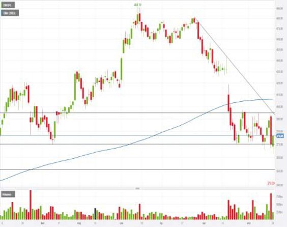 Popołudniowe umocnienie WIG20 ze środy było m.in. zasługą znacznej poprawy notowań Dino Polska. W pierwszej godzinie środowego handlu akcje Dino staniały nawet do 363 zł, choć kilkadziesiąt minut później zaczynały już świecić na zielono. Poranna słabość oznaczała jednak zejście kursu na nowe minima w ramach korekty spadkowej, rozpoczętej w drugiej połowie lipca. Następnie zniżki te podkręciły słabsze od oczekiwań wyniki kwartalne spółki. Od drugiej połowy sierpnia kurs sieci sklepów detalicznych porusza się w ramach trendu bocznego, ograniczonego od dołu poziomem 370 zł, a od góry okolicami 395 zł. Dokładnie przed tygodniem notowania naruszyły dolne ograniczenie tej konsolidacji. Popyt przysnął, ale zdążył zareagować, podbijając kurs jeszcze przez dwa kolejne dni, w okolice górnego ograniczenia ruchu bocznego. We wtorek zniżka o 4,8 proc. ściągnęła kurs na sam dół konsolidacji. Widać zatem, że kupujący mają coraz mniej argumentów, a obrona kluczowego wsparcia zaczyna się sypać.