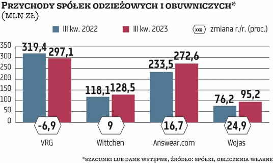 Wstępnymi danymi o przychodach w trzecim kwartale podzielił się także podwarszawski Wittchen, sieć sklepów z walizkami, torbami i akcesoriami skórzanymi, której wyniki półrocza mocno rozczarowały wcześniej inwestorów. Jędrzej Wittchen, prezes i główny akcjonariusz spółki, pytany o wyniki kolejnych miesięcy mówił o nich, że są „pozytywne” i zalecał porównywanie rezultatów na tle branży. Tej bezpośredniej na warszawskiej giełdzie nie ma. W zestawieniu z firmami z WIG-odzież Wittchen zaliczał się do spółek rosnących, ale wolno. Przychody spółki urosły rok do roku o 9 proc., do 128,5 mln zł.