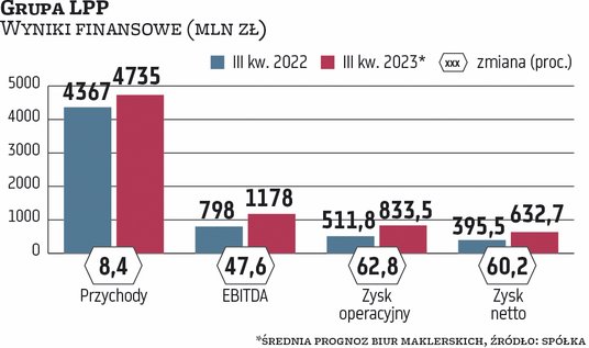 Największa grupa analityków i inwestorów czeka na informacje z tej ostatniej firmy, największego reprezentanta branży w kraju i na giełdowym rynku. Średnia prognoz biur maklerskich, które ankietował „Parkiet”, wskazuje, że w III kwartale zakończonym 31 października Grupa LPP miała 4,74 mld zł przychodu, o 8,4 proc. więcej niż rok temu, i mieściła się pod względem tempa wzrostu skali biznesu w drugiej połowie listy spółek z WIG-Odzież. Natomiast analitycy spodziewają się skokowego wzrostu zysków LPP w porównaniu z trzecim kwartałem 2022 r.
