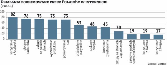 Najczęściej wybierane kategorie produktów to odzież, obuwie, kosmetyki, książki i płyty, produkty farmaceutyczne oraz sprzęt RTV/AGD. Około trzech czwartych badanych deklaruje robienie zakupów na polskich stronach internetowych. Na zagranicznych kupuje około 30 proc., a poprzez media społecznościowe 19 proc. Na razie Polacy dość sceptycznie podchodzą do zakupów w mediach społecznościowych, ale zdaniem ekspertów to obszar, który będzie zyskiwał na popularności. Szczególnie biorąc pod uwagę fakt, że coraz więcej mediów społecznościowych rozwija funkcje zakupowe w swoich aplikacjach.
