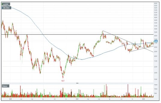 Trwałe wyłamanie powyżej średniej dwustusesyjnej może jednak zapowiadać szersze zwyżki. Jak na razie – w okresie kilku miesięcy – Allegro porusza się w mało dynamicznym trendzie wzrostowym, poprowadzonym przez dołki z października i listopada zeszłego roku oraz ze stycznia tego roku. Rosnące w ostatnich dniach obroty wskazują, że popyt powinien szybko uporać się z lokalnymi oporami w postaci szczytu z końcówki ub.r. (wówczas doszło do wybicia ze średnioterminowego trendu spadkowego). Poważnym sprawdzianem zamiarów kupujących będą okolice 36,6 zł, gdzie przebiega linia pozioma, poprowadzona przez szczyt z marca 2022 r. oraz poprzednie lokalne dołki.
