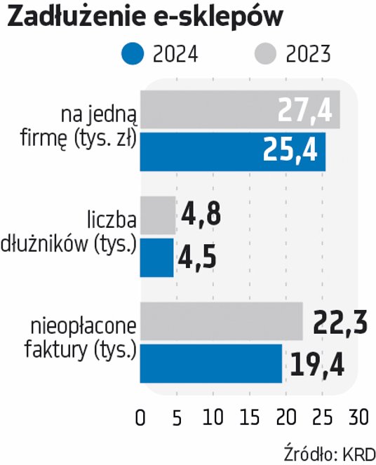 Średnio na jeden zadłużony e-sklep przypada 27,4 tys. zł długu, to o 2 tys. zł więcej niż w analogicznym okresie ubiegłego roku. W ciągu roku przybyło również 268 dłużników i 2941 nieuregulowanych faktur. Obecnie nieuregulowane jest 22,3 tys. zobowiązań 4,8 tys. firm. Rekordzista ma 2 mln zł długu.