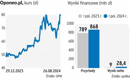 Wiarę inwestorów w internetowego dystrybutora m.in. opon wzmocniły bardzo dobre wyniki za II kwartał 2024 r. Jak wyjaśnia Piotr Łopaciuk, analityk Biura Maklerskiego PKO BP, spółka skorzystała na bardzo wysokiej rentowności w segmencie opon oraz dźwigni operacyjnej w szybko rozwijającej się spółce zależnej Dadelo, sprzedającej rowery. Marża brutto na sprzedaży brutto w I połowie 2024 r. zwiększyła się do 23,5 proc. z 18,6 proc. w analogicznym okresie rok temu.