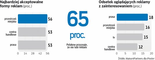 Z badania wynika, że jednymi z najmniej uciążliwych i najbardziej akceptowanych przez użytkowników form reklamy są te w przestrzeni miejskiej, co wskazało 56 proc. ankietowanych. Z kolei po 53 proc. przyznało, że podobnie traktuje przekazy w galeriach handlowych oraz prasie.