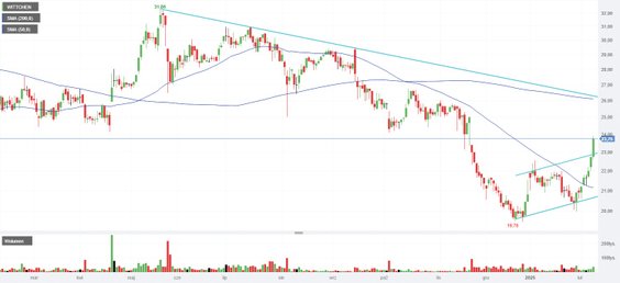 Ostatnie pół roku dla spółek handlowych było trudniejszym okresem. Dane o konsumpcji raczej rozczarowywały, ale teraz rynek wierzy w lepsze czasy. Pierwsza fala umocnienia tego typu biznesów pojawiła się w styczniu i objęła raczej większe firmy. Teraz najwyraźniej czas na mniejsze. Akcje Wittchena rosły w poniedziałek o 4,4 proc., powiększając tegoroczny dorobek do ponad 14 proc., choć pierwszy miesiąc roku zakończył się ledwie 0,5-proc. umocnieniem. Atak popytu jest więc bardzo świeży i wygląda na to, że trend wzrostowy Wittchena dopiero pączkuje. Kurs dopiero co ubił dno w strefie wokół 20 zł. Pierwsza, styczniowa fala odreagowania zatrzymała się na około 22,4 zł, po czym rynek jeszcze raz przetestował 20 zł. Tym razem popyt przyłożył się mocniej i już w zeszłym tygodniu wybił poprzedni szczyt. W poniedziałek zaś wybicie to zostało potwierdzone. Nie wykluczone, że dojdzie jeszcze do testu wybitego szczytu, który teraz ma funkcję wsparcia. Obrona pułapu 22 zł powinna jednak zaowocować wyprowadzeniem kolejnego ataku popytu. Następnie poważnym sprawdzianem dla kupujących będą okolice 26 zł, gdzie kurs spotka się z linią trendu spadkowego, poprowadzoną po szczytach z zeszłego roku. Tu także zbiega się linia średniej dwustusesyjnej ceny. Po wybiciu obu kresek popyt powinien wziąć sobie za cel szczyty sprzed blisko dwóch lat.