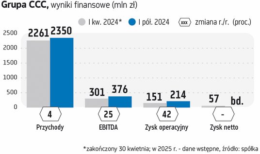 2,35 mld zł przychodu, 214 mln zł zysku operacyjnego, 376 mln zł zysku operacyjnego powiększonego o amortyzację (EBITDA) i 320 mln zł skorygowanej EBITDA wykazała wstępnie Grupa CCC po pierwszym kwartale nowego roku obrotowego 2025/2026.
