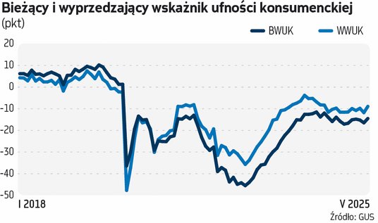 Bieżący wskaźnik ufności konsumenckiej, który zbiera w sobie ocenę aktualnej sytuacji własnego gospodarstwa domowego i generalnej sytuacji ekonomicznej kraju, oczekiwania na kolejny rok w obu aspektach oraz obecną gotowość do dokonywania ważnych zakupów, jest ujemny niezmiennie od początku pandemii w 2020 r. To sygnał, że wciąż przewagę mają negatywne odczucia. Niemniej majowy odczyt (-14,5 pkt) okazał się najwyższy od września 2024 r. i zbliżył się do maksimów z ostatniej połowy dekady (około 11,5–12,5 pkt na minusie w pierwszej połowie 2024 r.). Z kolei wskaźnik wyprzedzający, który agreguje wyłącznie oczekiwania na przyszłość (co do sytuacji finansowej gospodarstwa domowego, sytuacji ekonomicznej kraju, zmiany poziomu bezrobocia i możliwości oszczędzania pieniędzy, w maju wybił do poziomu niewidzianego od czerwca 2024 r., czyli niemal od roku.