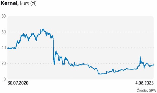 Notowania Kernela w ostatnich dniach oscylują w przedziale 18–19 zł, zbliżając się do 19,45 zł. To właśnie na tyle wartość godziwą akcji Kernela wyceniło KPMG w raporcie sporządzonym na zlecenie Namsena, wiodącego akcjonariusza, w związku ze zgłoszonymi żądaniami odkupu akcji przez akcjonariuszy mniejszościowych.