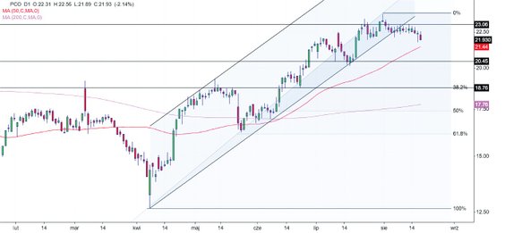 Po blisko 27-proc. umocnieniu Pepco Group w czerwcu, w lipcu akcje zyskały 8 proc., ale sierpień jest już spadkowy. Fala wzrostowa od początku kwietnia ukształtowała się w strukturę pięciofalową. W dłuższym terminie wciąż mamy zatem do czynienia z trendem wzrostowym, natomiast w krótkim terminie możemy spodziewać się spadków. Pod koniec środowej sesji walory Pepco Group osuwały się o 2,2 proc., schodząc do minimów z wtorku, a to zwiastowało też najsłabsze zamknięcie od ponad miesiąca. Jak widać na wykresie, w pierwszej połowie sierpnia wielokrotnie popyt atakował 23 zł, ale bezskutecznie. W tym miejscu kupujący mieli też problem w połowie lipca, ale ostatecznie udało się dotrzeć do niemal 24 zł. Zejście poniżej 23 zł, a następnie szereg nieudanych prób powrotu poniżej tego poziomu to zwiastun zmiany trendu przynajmniej w krótkim terminie. Mamy też potwierdzone wybicie z kanału wzrostowego. Konsekwencje? Kurs może się cofnąć do 18,8 zł, czyli 38,2-proc. zniesienia Fibonacciego. W tym miejscu przebiega też linia poprowadzona przez szczyty z marca i maja tego roku. Poziom 18,8 zł został też potwierdzony – tym razem jako wsparcie – na sesji z 23 czerwca.