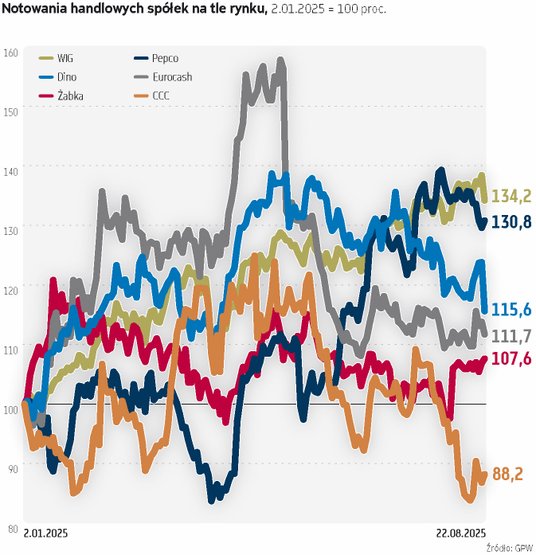 Tegoroczny wzrost realnej dynamiki funduszu płac zwiększa popyt na towary i usługi, co widać w danych dotyczących sprzedaży detalicznej. Paliwem dla konsumpcji jest też cykl obniżek stóp procentowych, zwiększający dostępność finansowania dla konsumentów i przedsiębiorców. Te trendy są wsparciem branży handlowej, w tym spółek notowanych na GPW. Ale ich kursy w 2025 r. przegrywają z WIG-iem.