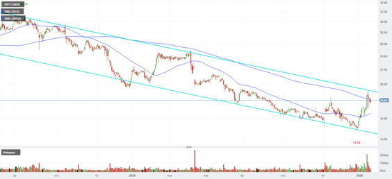 Od połowy 2024 r. Wittchen porusza się w kanale spadkowym, który na przełomie lat 2025-2026 doprowadził kurs w okolice 15 zł. Pod koniec zeszłego roku spadek zaczął wyhamowywać, a obroty rosnąć. Połączenie tych pozytywnych okoliczności przyniosło styczniowy rajd notowań, ale jak na razie trudno mówić o przełomie. Zwyżka zatrzymała się dokładnie przy górnym ograniczeniu wielomiesięcznego kanału spadkowego. Reakcja podaży była w ostatnich dniach dość silna i towarzyszyły jej również podwyższone obroty. Co więcej, kurs osunął się znów poniżej średniej pięćdziesięciosesyjnej. Na ten moment trudno zatem mówić o trwałym przejęciu inicjatywy przez popyt. Ruch od okolic 15 zł może kształtować się w układzie pięciofalowym, a jeśli tak, to obecnie popyt musiałby się przygotowywać do wyrysowania fali piątej, której głównym zadaniem będzie wybicie lokalnego szczytu. Potwierdzeniem przewagi podaży będzie w krótkim terminie zejście w cenach zamknięcia poniżej 17 zł.
