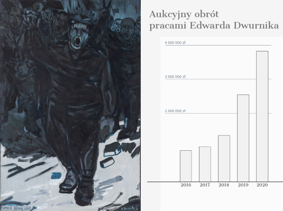 O ile każde pojawienie się pracy Andrzeja Wróblewskiego w katalogu celebrowane jest przez kolekcjonerów jak święto, inny król rodzimego rynku - Edward Dwurnik - zawdzięcza swoją rozpoznawalność właśnie ogromnej ilości notowań aukcyjnych. Z danych Artprice wynika, że nieprzerwany wzrost obrotu jego pracami utrzymuje się od 8 lat, natomiast najrzadsze olejne dzieła z lat 60-80. zdołały od 2016 r. podwoić swoją średnią wartość. Rok, w którym świat borykał się z pandemią, odznacza się w aukcyjnych danych najwyższym od dwóch dekad popytem na dzieła Edwarda Dwurnika.