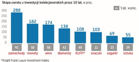 Najbardziej znany jest Knight Frank Luxury Investment, wskaźnik odzwierciedlający stan rynku dóbr luksusowych, stworzony przez firmę Knight Frank. Wynika z niego, że pięcioletnia inwestycja w auta klasyczne przyniosła 91 proc. zysku, a 10-letnia 288 proc. (dane z połowy 2018 r.). To znacznie mniej niż przed rokiem, ale i tak wyniki są bardzo dobre.