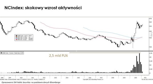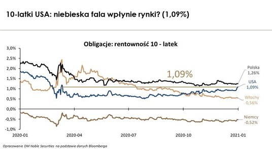 Materializuje się scenariusz niebieskiej fali. Triumf demokratów oznacza szybką ścieżkę legislacyjną i szybsze wdrożenie pakietów stymulacyjnych. To przekłada się na obawy o deficyt budżetowy USA i spadek cen 10-letnich obligacji amerykańskich. Rynek obligacji wyznacza trendy i ma istotne znaczenie dla akcyjnego, chociażby w tym kontekście, że im wyższa rentowność (stopa wolna od ryzyka) tym większa presja na giełdowe parkiety. Z drugiej strony – pakiet stymulacyjny to perspektywa wsparcia klasy średniej i niższej, wyższe podatki dla spółek wzrostowych i wzrost konsumpcji przekładający się na poprawę nastawienia do spółek wartościowych. Dlatego zwracam uwagę na rynek długu. Od jego zachowania będzie też zależeć działanie Fedu, co jak wiemy jest również istotne dla ogólnego nastawienia inwestorów.
