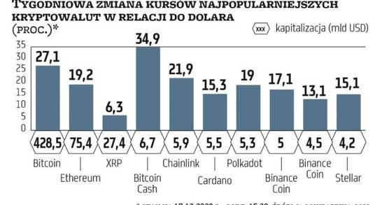 W takich momentach jak obecnie trzeba zachować chłodną głowę. Bitcoin jest na historycznym szczycie. Jego wycena podwoiła się w niecałe trzy miesiące, a licząc od marcowego dołka skala wzrostu sięga już 500 proc. To wprawdzie o połowę mniejszy dorobek niż Tesli, ale jednak na tyle duży, by mieć z tyłu głowy rosnące ryzyko korekty. Już w czwartkowe popołudnie mieliśmy namiastkę tego, co kurs bitcoina potrafi zdziałać. Z 23 600 USD w niecałą godzinę notowania tąpnęły o 5,5 proc., uszczuplając wycenę o 1300 USD.