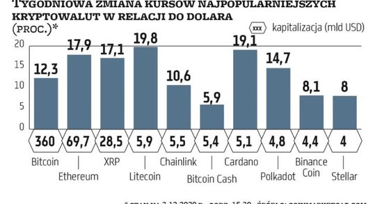 Kurs ethereum sięgnął 635 USD, a więc znalazł się najwyżej od wiosny 2018 r. Z kolei cena XRP w porywach sięgnęła 0,84 USD, co oznacza, że od marcowego dołka oddaliła się o 632 proc. W czwartkowe popołudnie kapitalizacja całego rynku wynosiła 580 mld USD, a więc prawie cztery razy więcej niż dziewięć miesięcy temu. Rynek jest mocno rozgrzany, co powoduje podwyższoną wrażliwość na medialne informacje i analogiczną zmienność notowań.
