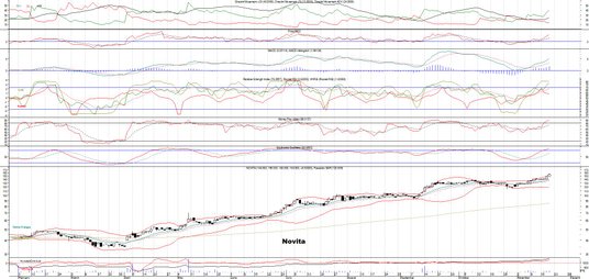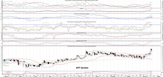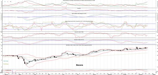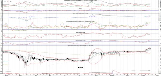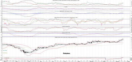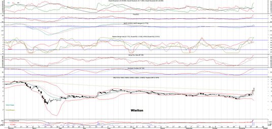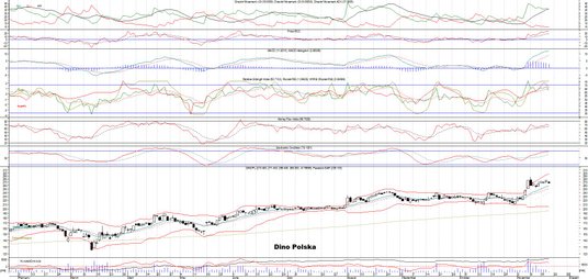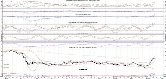 W tym przypadku też gramy pod wybicie górą z bazy. MACD zakręcił w górę nad linią 0, co zawsze odbieram jako pokaz siły danego waloru. Wskaźnik ruchu kierunkowego potwierdza kierunek i siłę trendu . Stochasti i RSI doszły już do poziomów wykupienia, ale mają jeszcze przestrzeń do zwyżek. Trochę gorzej interpretuje się tutaj wskaźnik Akumulacja/Dystrybucja, bowiem w międzyczasie pojawiły się dwa duże słupki wolumenowe, które trochę zaburzają odczyt. Niemniej ostatnio wolumen znów wzrósł potwierdzając falę zwyżek, podobnie zresztą jak średnia 13-sesyjna, która zakręciła w górę. Cena trzyma się teraz górnej wstęgi Bollingera, więc można powiedzieć, że to taka "klasyka westernu AT".