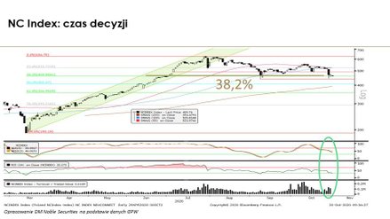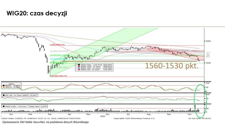 Mam wrażenie, że rynek jest w takiej fazie, że mamy dwa skrajne wyjścia - albo za wszystko kupujemy akcje, albo całkowicie z rynku uciekamy. Gdyby trzymać się teorii równości fal, to C powinna być równa A, co daje nam zasięg 1530-1560 pkt. Ten poziom został już osiągnięty, co w połączeniu z dużym wyprzedaniem sygnalizowanym przez oscylatory i sprzyjającej sezonowości (koniec negatywnego efektu haloween, spodziewane efekt grudnia i stycznia) skłania mnie do obstawienia 60 do 40 na korzyść scenariusza odbicia.