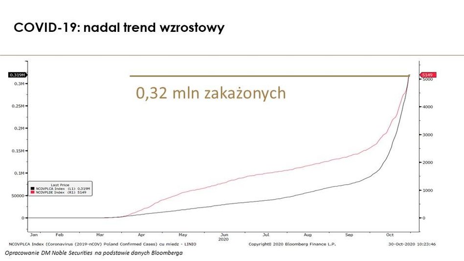 W tym momencie faktycznie jest to najbardziej istotna dla rynków statystyka. Ja bym jednak nie przywiązywał wagi do samych liczb, a bardziej do trendu. A ten jest wzrostowy, a jego tempo dynamiczne. Różne szacunki mówią, że szczyt osiągniemy na przełomie listopada i grudnia, choć wiele będzie zależeć od skuteczności wprowadzanych restrykcji. Pandemia pozostanie więc jeszcze przez jakiś czas głównym czynnikiem ryzyka, choć zwracam uwagę na optymistyczne wieści z firmy Moderna, która jest na zaawansowanym etapie tworzenia szczepionki i w środę ogłosiła, że ma kontrakt na dostarczenie 50 mln dawek do Japonii w pierwszym półroczu 2021 r. Myślę, że takich informacji będzie się pojawiać więcej, co będzie redukować negatywny wpływ tego czynnika ryzyka.