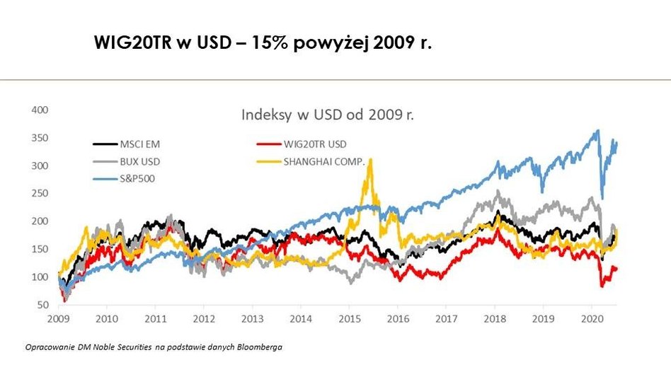 Generalnie od 2009 r. rynki wschodzące są słabsze od rynków rozwiniętych. Czyli mamy dekadę słabości MSCI EM względem np. DAXa. W poprzedniej dekadzie, czyli do 2009 r. ten układ sił był odwrotny. Z tego punktu widzenia teraz powinniśmy zacząć nadrabiać ten dystans i siła powinna wrócić do rynków wschodzących. Biorąc pod uwagę obawy inflacyjne i relatywną siłę spółek wzrostowych względem wartościowych, zastanawiam się, czy nie nadchodzi właśnie moment tej cyklicznej zmiany. Zwłaszcza, że patrząc na wykres WIG20TR w USD trzeba sobie uczciwie przyznać, że on cały czas szoruje po dnie.