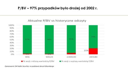 Patrząc na GPW szeroko, cały czas jest tanio, o czym świadczy to, że zdecydowanie większość sesji w przeszłości była z P/BV wyższym niż obecnie. W przypadku sWIG80 ta atrakcyjność trochę zmalała (79 proc. sesji z wyższym wskaźnikiem), ale wydaje mi się to naturalne po słabych, poprzednich latach. Inwestorzy przypomnieli sobie o maluchach, co widać po obrotach, które czasem potrafią w tym segmencie przekroczyć podczas sesji 80 mln zł. Jest więc płynność, są stopy zwrotu, a przy obecnym P/BV można powiedzieć, że ten segment wciąż jest umiarkowanie tani.