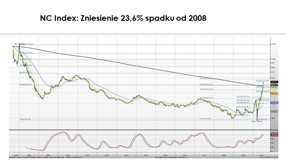 Na ten moment przyjacielem, choć patrząc na dynamikę zwyżek mam takie obawy o powtórkę z pionierskich lat 90-tych, gdy na GPW wszystko rosło, a potem korekta zniosła większość tego dorobku. Zwróciłbym jednak uwagę, że zwyżkom na NC towarzyszą wysokie obroty, ostatnio sięgnęły na sesji nawet 96 mln zł. Poza tym w ujęciu długoterminowym trwający wzrost zniósł dopiero 23,6 proc. bessy. W tym kontekście potencjał do zwyżek na małym parkiecie wciąż wydaje się duży, choć korekty mogą być równie gwałtowne, jak obserwowane fale wzrostowe.