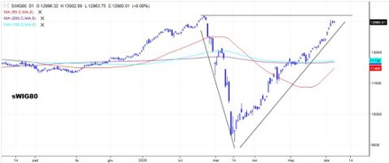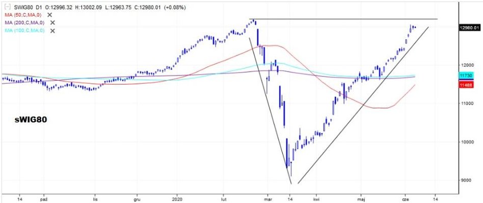 Część małych spółek ma całkiem niezłą sytuację fundamentalną, a trwający kryzys może niektórym z nich nawet pomagać w dłuższym terminie. Są też tutaj podmioty, które na pandemii bezpośrednio korzystały. Mimo wszystko – po tak silnych wzrostach w tak krótkim czasie, byłbym w odniesieniu do maluchów ostrożniejszy. W krótkim terminie passa może trwać, ale w dłuższym mam takie same obawy, jak w odniesieniu do WIG20. Proszę zwrócić uwagę, ze sWIG80 "flirtuje" już z lutowym maksimum, co sugerowałoby, że wszystko już wróciło do normy. Tymczasem stan polskiej gospodarki od normy z początku roku raczej jest daleki.