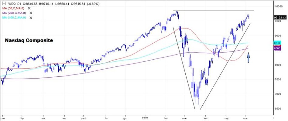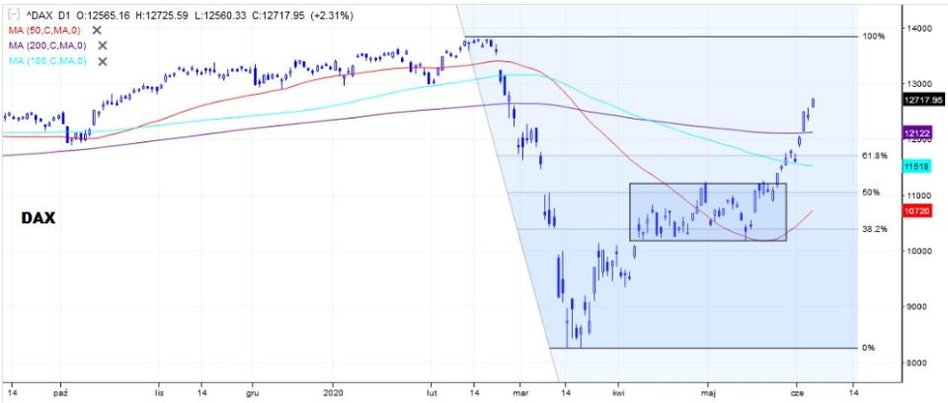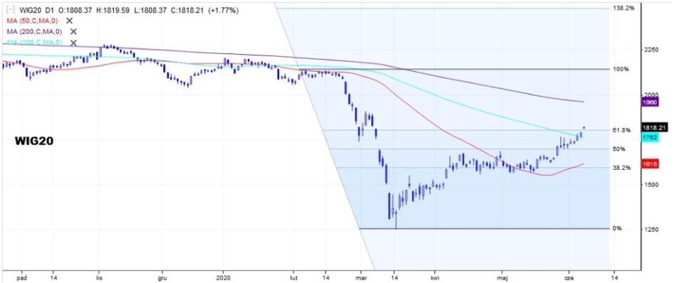 Jestem zaskoczony jego siłą i nie tylko jego, ale wszystkich głównych rynków akcyjnych. Gdy popatrzymy na wykresy indeksów to widać wybicie z kilkutygodniowej konsolidacji, co z punktu widzenia AT sygnalizuje ruch wzrostowy. W mojej opinii rynki dyskontują teraz najbardziej optymistyczny scenariusz, w którym z kryzysu wychodzimy szybciej i znacznie mniej poturbowani niż przypuszczano. Uważam, że w krótkim terminie to jest sensowne zachowanie, bo jak widać stopniowe odmrażania gospodarek sprawia, że spółki, które najmocniej dotknął lockdown wracają teraz z niebytu i inwestorzy kupują ich akcje. W wąskim horyzoncie czasowym pozostają więc optymistą, zwłaszcza, że mamy też kolejne wsparcia fiskalne, jak czwartkowe rozszerzanie programy PEPP. W szerszym ujęciu czasowym byłbym ostrożny. Myślę, że negatywne niespodzianki mogą się pojawić, bo przecież koronawirus nie zniknął, a w niektórych przypadkach otwieranie gospodarek wcale nie jest tak płynne, jakbyśmy oczekiwali. Chiny nie podnoszą się tak szybko, jak się spodziewaliśmy.