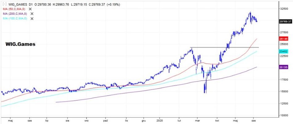 Przy okazji WIG.GAMES warto zauważyć, że w ostatnich dwóch tygodniach, zarówno w Polsce jak i zagranicą, widać pewną rotację sektorową. Otóż te podmioty, które do tej pory bardzo mocno drożały, czyli szeroko pojęta branża technologiczna, ostatnio dostały zadyszki. Gdy szeroki rynek idzie w górę to one tracą lub rosną mniej, niż biznesy bardziej tradycyjne. To schłodzenie wydaje się całkiem naturalne, bo te spółki najwięcej pozytywnego zdyskontowały. I choć w krótkim terminie cofnięcie jest uzasadnione, to w szerszym wydaje mi się, że wciąż mają one dobre perspektywy. Chociażby dlatego, że ten kryzys tylko przyspieszył trend powszechnej cyfryzacji.