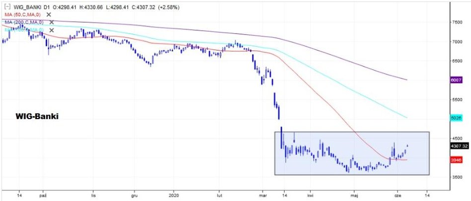 Z uwagi na wagę banków w WIG20, długoterminowa hossa bez ich udziału nie ma racji bytu. Ten sektor, patrząc po wykresach, wyraźnie odstaje na minus od reszty rynku. On dopiero próbuje odbić się od dna. Trzeba jednak pamiętać, że ten sektor został najbardziej poszkodowany w wyniku kryzysu, przez obniżkę stóp i wzrost kosztów ryzyka. Ostatnia decyzja RPP była szczególnie dotkliwa i jeszcze bardziej pogorszyła ich perspektywy. Ostatnie próby odbicia wynikają chyba z nastrojów zagranicznych, bo wyceny banków w USA czy Europie zachodniej zaczęły sobie ostatnio radzić lepiej, co chyba jest też efektem odmrażania gospodarek, a co za tym idzie, oczekiwaniem że firmy powrócą do normalnej działalności i te koszty ryzyka spadną. Niemniej w odniesieniu do naszego sektora pozostaje ostrożny, bo fundamentalnie nie widzę tam pozytywnych sygnałów.