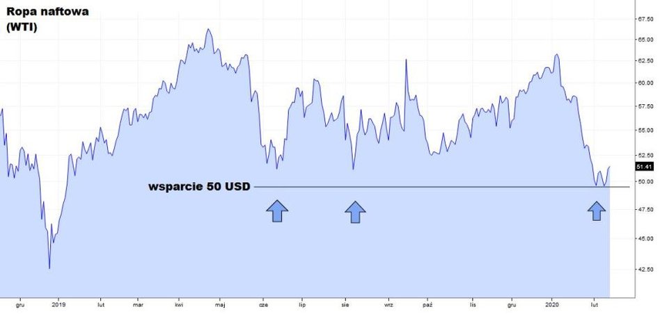 Pozostając jeszcze w temacie rynków globalnych – wspominałeś o ropie naftowej, która tanieje z powodu epidemii koronawirusa. Kurs baryłki WTI dotarł ostatnio do 50 USD. Poziom ten nie raz inicjował silne odbicie. Myślisz, że ropa jest już lokalnie wyprzedana?