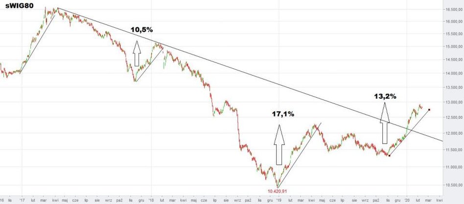 Na analizę techniczną patrzę w drugiej kolejności. Bardziej interesują mnie fundamenty spółek z tego indeksu. I trzeba przyznać, że wzrosty mWIG40 nie są bez przyczyny. Są zdrowe, w tym kontekście, że rynek rośnie szeroko, a nie przy pomocy kilku podmiotów. Poza tym zdecydowanie uległy poprawie perspektywy zysków tych spółek, chociażby w porównaniu z tym co było rok temu. Tak więc fundamenty uzasadniają to co dzieje się na wykresie i jeśli ktoś szuka na GPW spółek wzrostowych, to mWIG40 i sWIG80 to jest dobre pole do selekcji.