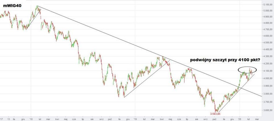 Zdecydowanie lepiej wyglądają średnie spółki. Indeks mWIG40 zyskał od jesieni 14 proc. Na GPW wzrosły obroty – średnia dzienna za styczeń to 862 mln zł, podczas gdy w 2019 r. było to prawie 100 mln zł mniej. Zastanawiam się, czy mWIG40 będzie kontynuował ten rajd? Bo jak spojrzeć w przeszłość to te przełomy roku zazwyczaj bywają dla niego udane. Poza tym przy 4100 pkt można doszukiwać się podwójnego szczytu.