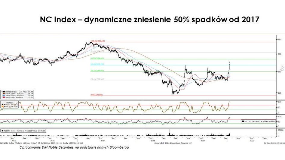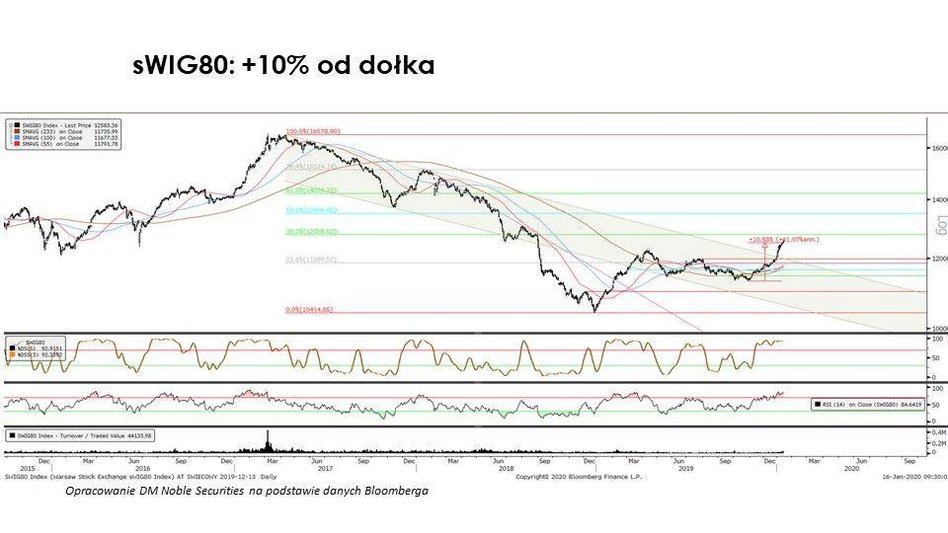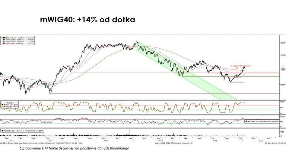 Wydaje mi się, że ten segment spółek jest swego rodzaju optimum. Z jednej bowiem strony jest bardziej płynny niż grono małych spółek, a z drugiej ma znacznie korzystniejszy bilans ryzyk niż firmy z WIG20. Poza tym wydaje mi się, że na jego korzyść działają potencjalne przepływy kapitału wynikające z przekształcenia OFE i braku debiutów giełdowych, które wysysają pieniądze z rynku. W 2019 r. było na GPW jedno duże IPO i ponad 30 wezwań. Kapitał z tych ostatnich powinien wracać na rynek i pchać notowania w górę. I jeszcze zwróciłbym uwagę na to, że o ile w 2019 r. po publikacji negatywnych informacji kurs spadał o ponad 10 proc., a na te dobre reagował neutralnie, to teraz jest odwrotnie. Wygląda więc na to, że rynek poszukuje argumentów za zaangażowaniem, co potwierdzają zresztą rosnące obroty. Konkluzja jest więc taka, że mWIG40 ma szanse dotrzeć lub nawet dynamicznie przekroczyć granicę 20 proc.