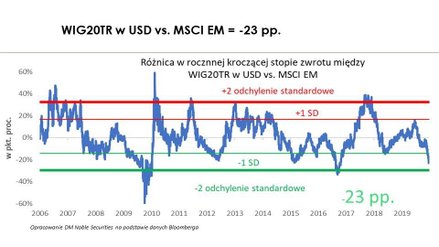 Przejdźmy teraz do rynku polskiego. Od jesieni utrzymuje się na GPW relatywna słabość blue chips. Wskazujesz, że jest ona widoczna także w relacji do MSCI EM, co by sugerowało, że nasze duże spółki są bardzo niedoszacowane.