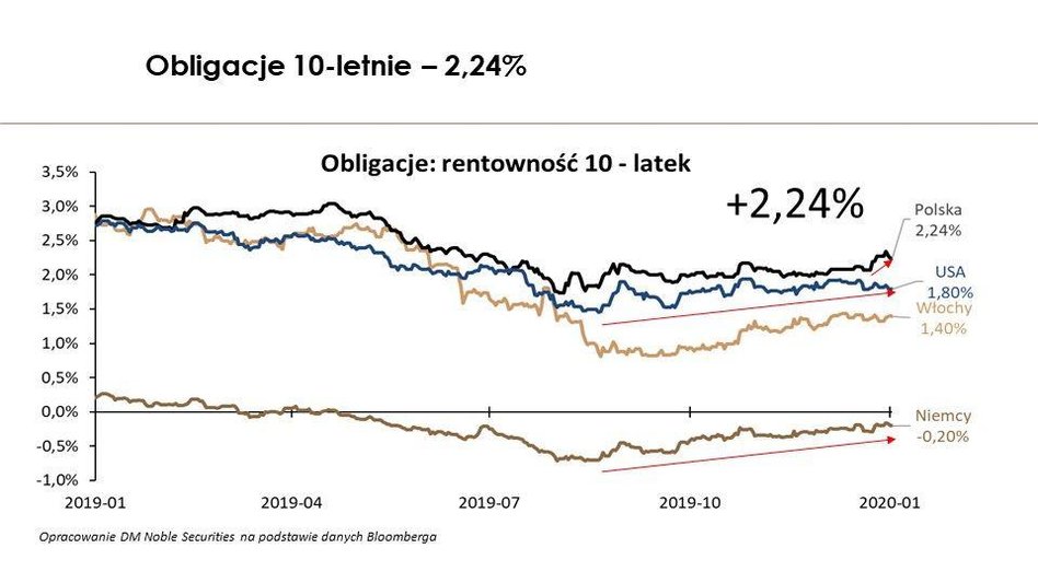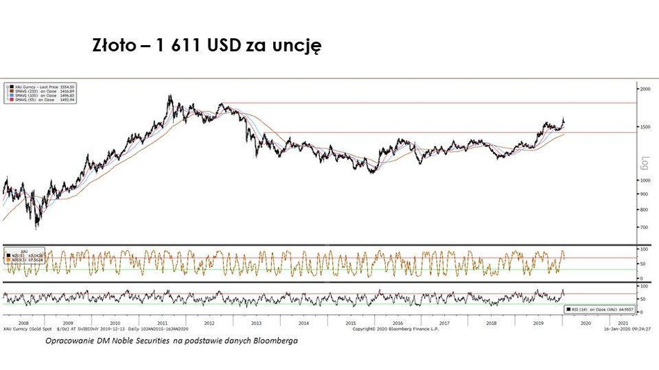 Grudniowy odczyt CPI wyniósł aż 3,4 proc. r/r. Ekonomiści musieli rewidować swoje prognozy na 2020 r., więc niewykluczone, że ta presja na RPP się utrzyma. Jeśli obligacje tracą potencjał, to jak może zachowywać się złoto? Rok zaczęło z przytupem – cena sięgnęła 1611 USD, a więc znalazła się na 7-letnim maksimum.