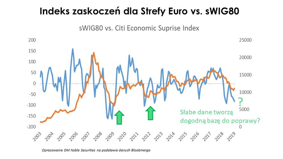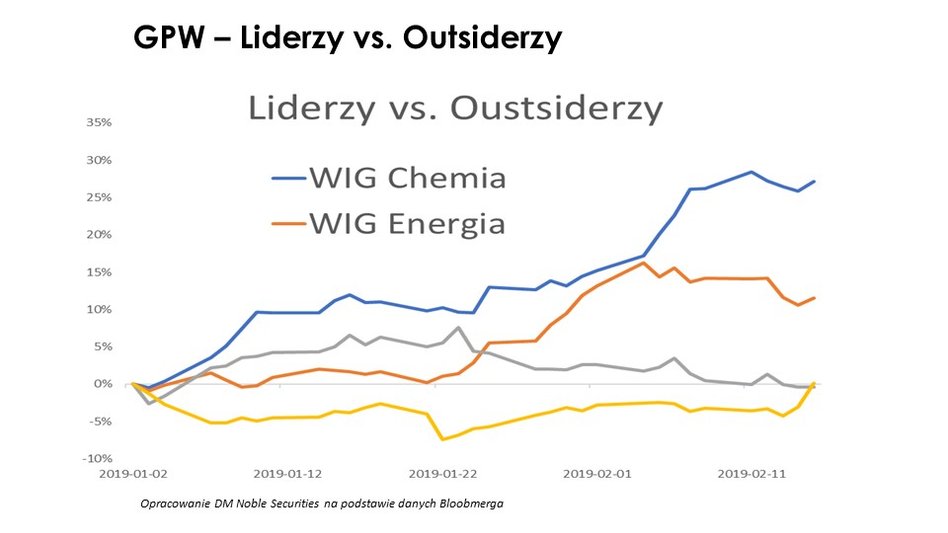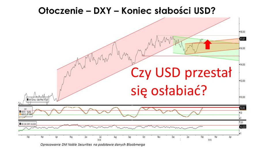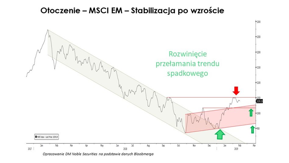 Na początku 2019 r. notowania indeksu rynków wschodzących wybiły się górą z ubiegłorocznego kanału spadkowego. Udało się w ciągu tych kilku tygodni wyznaczyć coraz wyższe dołki i szczyty, więc to ostatnie osłabienie nazwałbym stabilizacją po fali wzrostowej. Takie zachowanie jest normalne, zwłaszcza, że indeks wcześniej testował lokalne maksimum na 1050 pkt. Cofnięcie nie jest gwałtowne, więc na razie byki są bezpieczne. Najbliższe wsparcie to 1020 pkt, a ostatnią deską ratunku dla tej tendencji wzrostowej jest bariera 970 pkt.